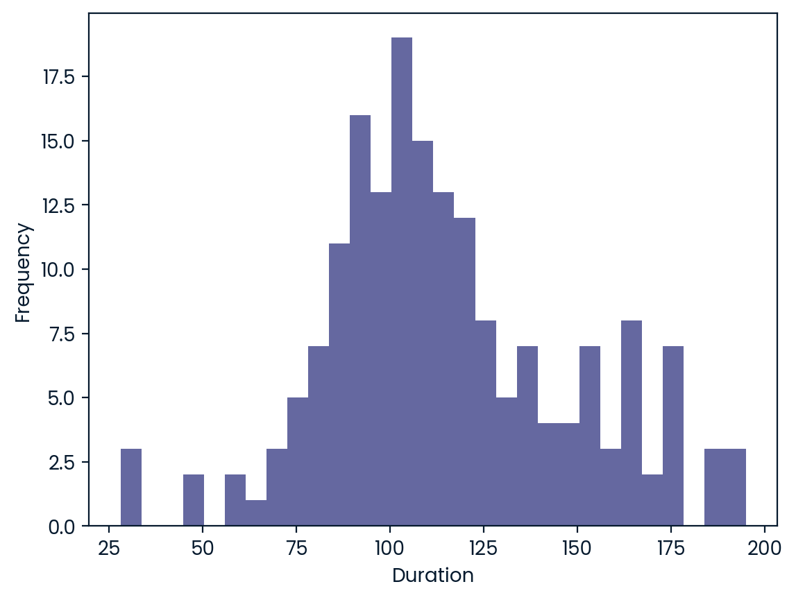 ::: {#56537e74-93a0-420f-9e97-b9fe68d64381 .cell executionCancelledAt=‘null’ executionTime=‘214’ lastExecutedAt=‘1721709310845’ lastExecutedByKernel=‘2467405a-029b-4165-8922-58e9bfe01187’ lastScheduledRunId=‘null’ lastSuccessfullyExecutedCode=’dur_90s = netflix_df_mov_90s[“duration”] plt.hist(dur_90s, bins=30) plt.xlabel(“Duration”) plt.ylabel(“Frequency”) plt.show()